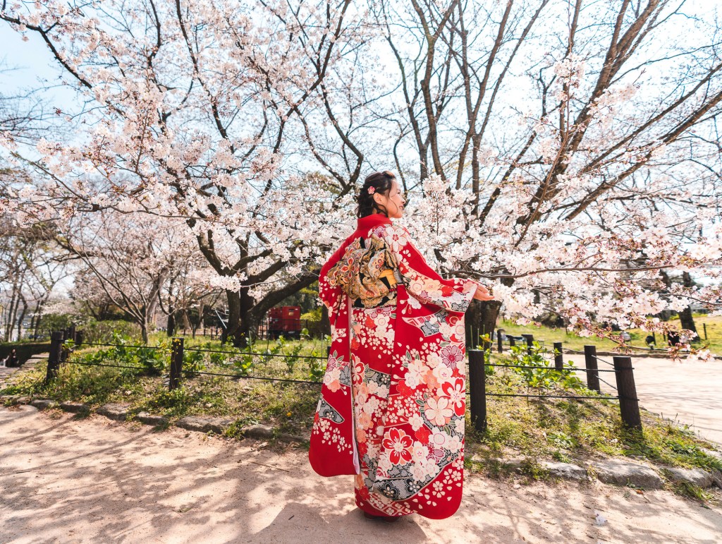 Mine-rental博多店在博多站徒步10分鐘的地方, 交通方便, 款式也很不錯, 這次客人實穿的是華麗的振袖方案, 搭配福岡的櫻花滿開超夢幻!
